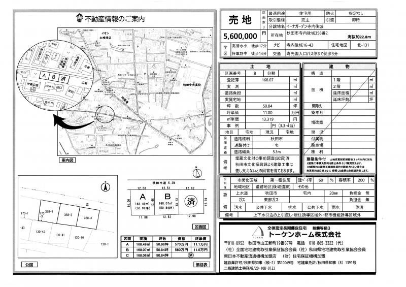 その他 | ※イオン土崎港店まで徒歩9分 ※寿光園入口バス停まで徒歩3分 ※南側隣接地が低いため陽当たり良好です。 ★ナビ 寺内後城16-43 ※建築条件付 |