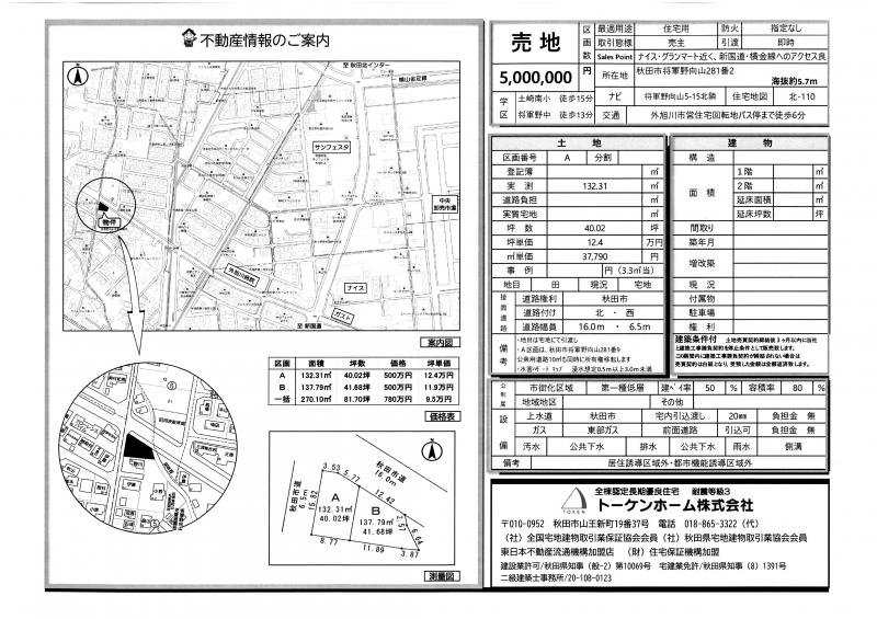 その他 | ※建築条件付※地目は宅地にて引渡し※角地 ※秋田市将軍野向山281番9 公衆用道路10m2も同時に所有権移転します ※水害ハザードマップ 浸水想定0.5m以上3.0m未満 |
